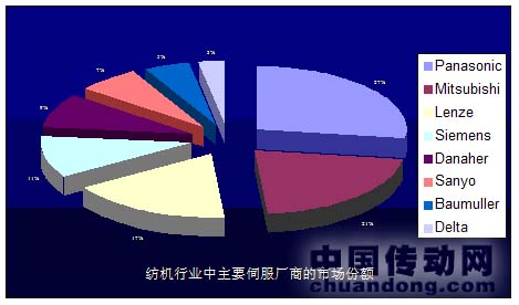 本站觀點:中國自古就講究男耕女織,這簡簡單單的四個字,就把農(nóng)業(yè)和紡織業(yè)在中國歷史的重要地位強調(diào)的淋漓盡致。農(nóng)業(yè)紡織業(yè)乃立國民生之本,它們的發(fā)展直接促進(jìn)了國家的經(jīng)濟(jì)騰飛。在“十一五”計劃中,紡織業(yè)已經(jīng)作為重點項目,得到國家政策的大力扶持。不管是過去還是未來,紡織業(yè)在國計民生中發(fā)揮著不可估量的作用。07年,紡織行業(yè)盡管內(nèi)外部壓力重重,但國內(nèi)紡織行業(yè)整體依然運行良好,據(jù)初步預(yù)計,07年全年紡織全行業(yè)收入和利潤總額同比分別增長20%和30%左右(數(shù)據(jù)來源:中華紡織網(wǎng))古老的紡織行業(yè)正在經(jīng)歷一次主動和被動的產(chǎn)業(yè)轉(zhuǎn)型和升級,以產(chǎn)能擴(kuò)張和同質(zhì)化初級產(chǎn)品貼牌出口為主的行業(yè)增長模式正在逐步遭到拋 棄,以技術(shù)創(chuàng)新、品牌培育和渠道建設(shè)為主的行業(yè)發(fā)展模式正在培育并將成為未來的主流模式。伺服技術(shù)在紡織設(shè)備上的應(yīng)用是為了提高設(shè)備的性能,滿足高精度控制的要求,目前已有高檔梳棉機、帶自動調(diào)勻整的并條機、新型粗紗機、數(shù)控細(xì)紗機、分條整經(jīng)機、漿紗機、園網(wǎng)印花機等設(shè)備應(yīng)用了伺服技術(shù)。國內(nèi)無梭織機制造廠已開發(fā)出交流伺服的電子送經(jīng)和電子卷取,今后伺服產(chǎn)品的需用量將非常可觀。下圖提供了紡機行業(yè)中主要伺服廠商的市場占比(圖片來源:中國傳動網(wǎng)2007版交流伺服系統(tǒng)在紡織機械行業(yè)市場分析報告):
