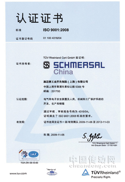 導語:經(jīng)過中國質量認證中心專家為期三天的認真細致的審核,施邁賽工業(yè)開關制造(上海)有限公司順利通過ISO9001:2000國際質量體系的認證復評