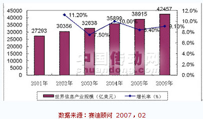 導(dǎo)語:隨著世界經(jīng)濟的繼續(xù)增長,2006年世界信息產(chǎn)業(yè)在機遇與挑戰(zhàn)的面前穩(wěn)健成長,全球IT產(chǎn)業(yè)逐步走向成熟