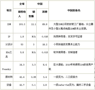 表一,全球集成電路產(chǎn)業(yè)價(jià)值鏈創(chuàng)造中中國的位置(2007)(單位:十億美元)