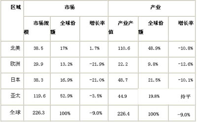 表二,全球半導(dǎo)體區(qū)域市場需求規(guī)模與產(chǎn)值創(chuàng)造比較表(2009)(單位:十億美元)