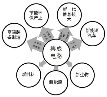 戰(zhàn)略性新興產(chǎn)業(yè)是整個(gè)國民經(jīng)濟(jì)發(fā)展的基礎(chǔ);集成電路產(chǎn)業(yè)是戰(zhàn)略新興產(chǎn)業(yè)的基石。七大戰(zhàn)略新興產(chǎn)業(yè)中四個(gè)與集成電路直接相關(guān)(見下圖);三個(gè)與集成電路產(chǎn)業(yè)間接相關(guān)。集成電路產(chǎn)業(yè)要抓住國家發(fā)展戰(zhàn)略新興產(chǎn)業(yè)的重大機(jī)遇,實(shí)現(xiàn)新一輪的騰飛。