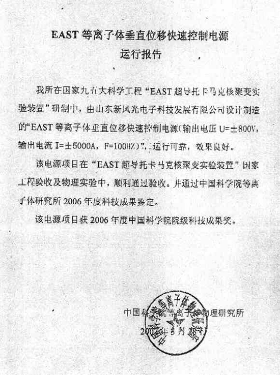 山東風(fēng)光為國家九五大科學(xué)工程“EAST超導(dǎo)托克馬克核聚變實(shí)驗(yàn)裝置”提供特種電源