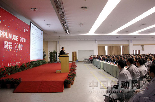 會上,產(chǎn)品研發(fā)、產(chǎn)品質(zhì)量、銷售推廣和商務(wù)政策等部門總監(jiān)作了年度工作匯報。銷售總監(jiān)和商務(wù)總監(jiān)在會上表示要完成2011年銷售目標(biāo),兌現(xiàn)承諾。為見證2010年取得的突出成績,胡成中、張東仁和大區(qū)經(jīng)理、億元分銷商代表一起在金色手摸板上留下各自的手印并合影留念。