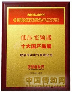 導(dǎo)語:由《變頻器世界》、中國機(jī)電一體化協(xié)會等單位主辦的第八屆變頻器行業(yè)企業(yè)家論壇于2011年9月16日至18日在北京舉行,會議期間頒發(fā)了“低壓變頻器十大國產(chǎn)品牌”獎項(xiàng),歐瑞傳動已連續(xù)六年獲此殊榮。