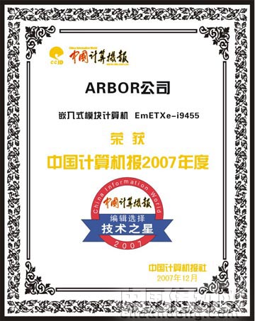 ARBOR EmETXe-i9455喜獲《中國計算機報》2007年編輯選擇獎-技術(shù)之星
